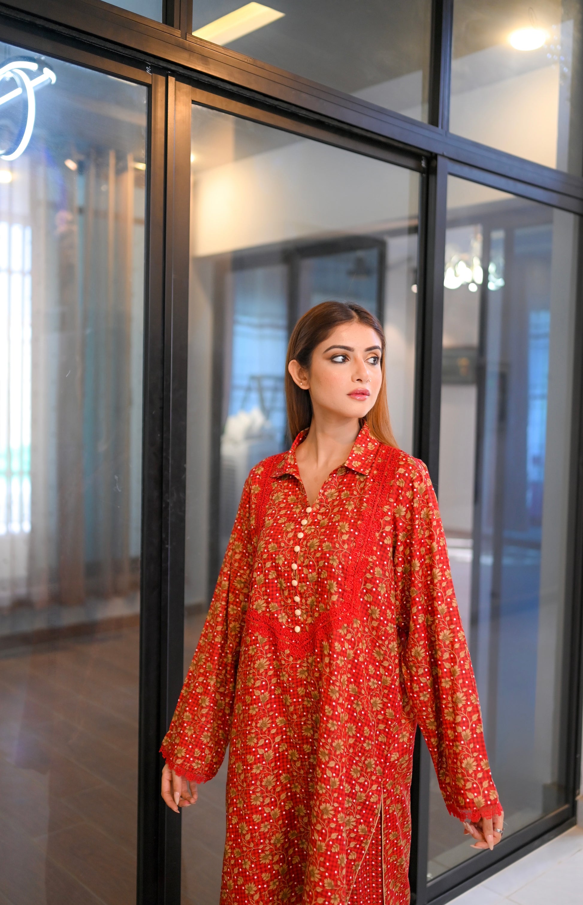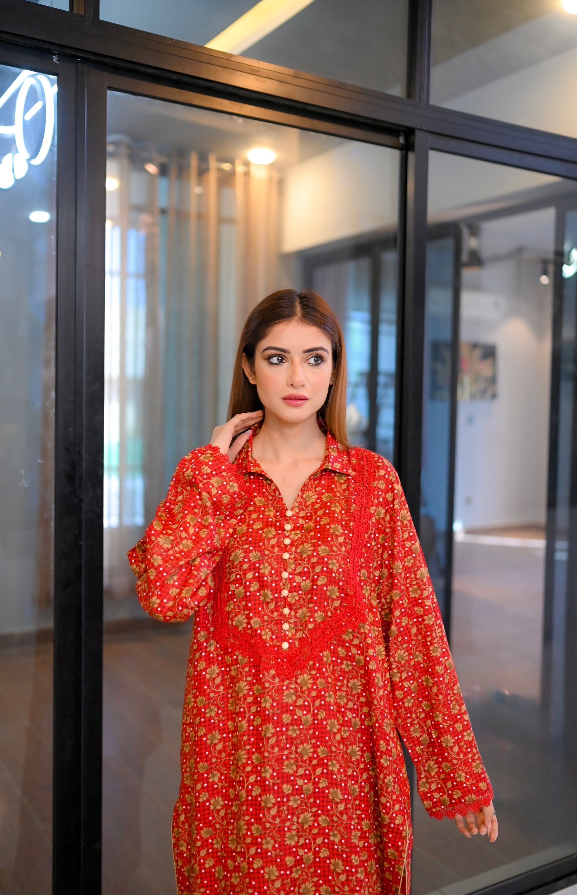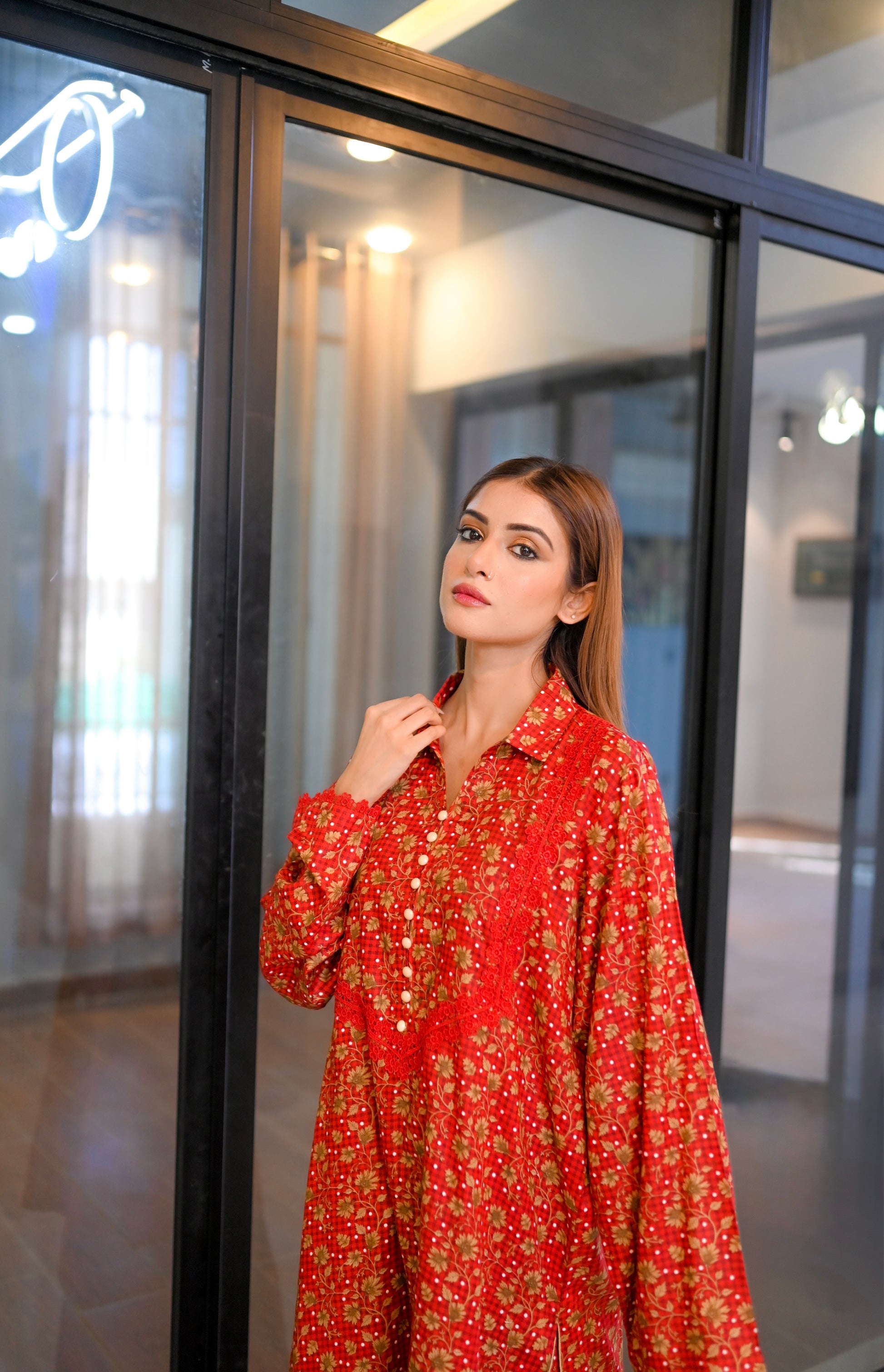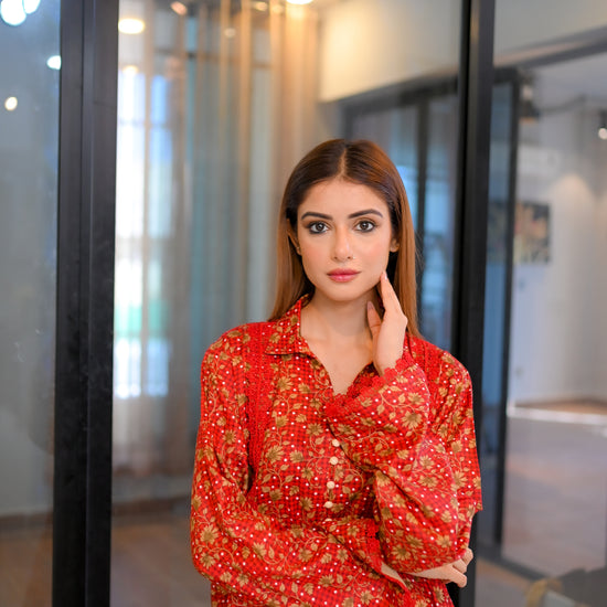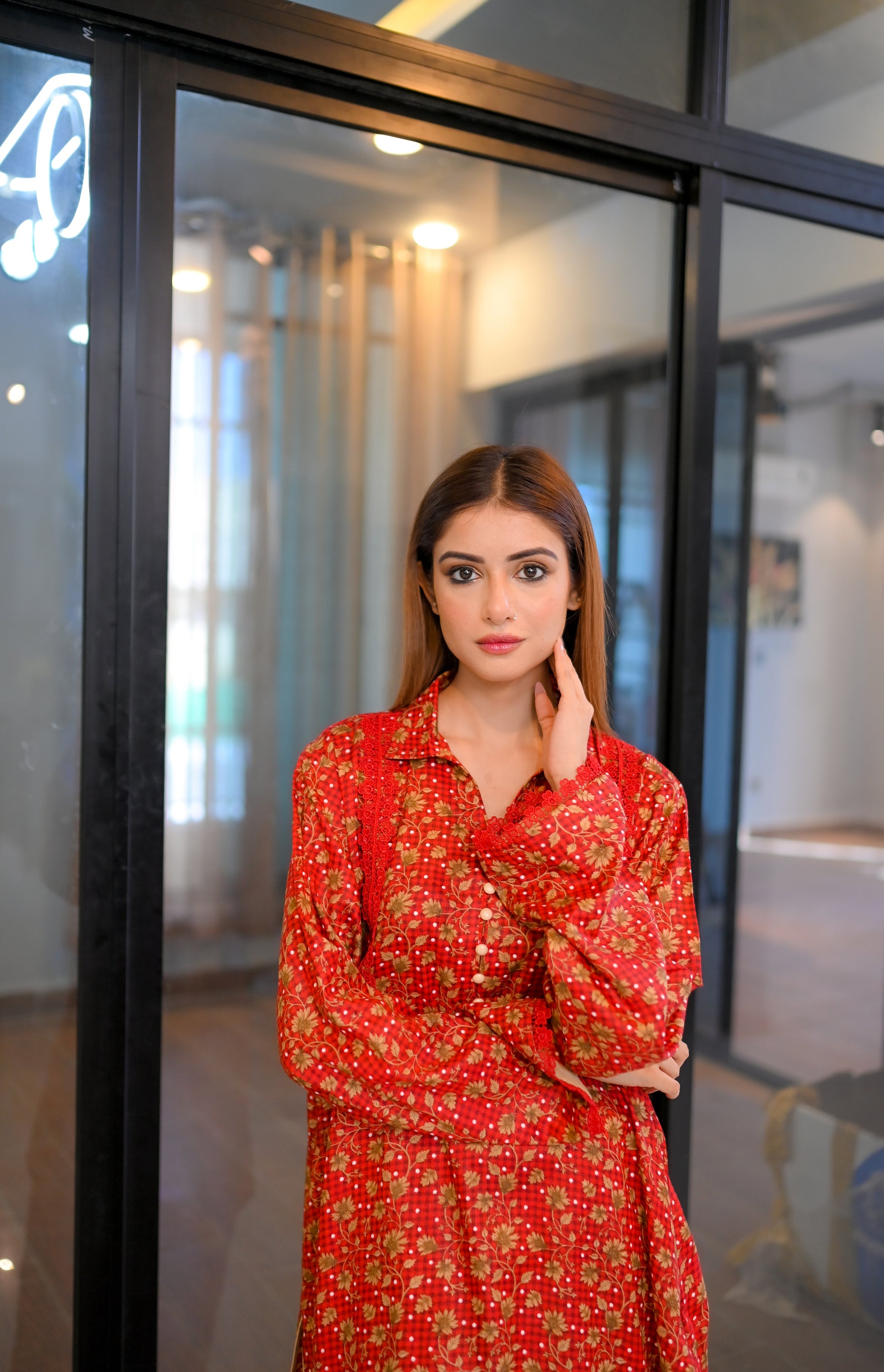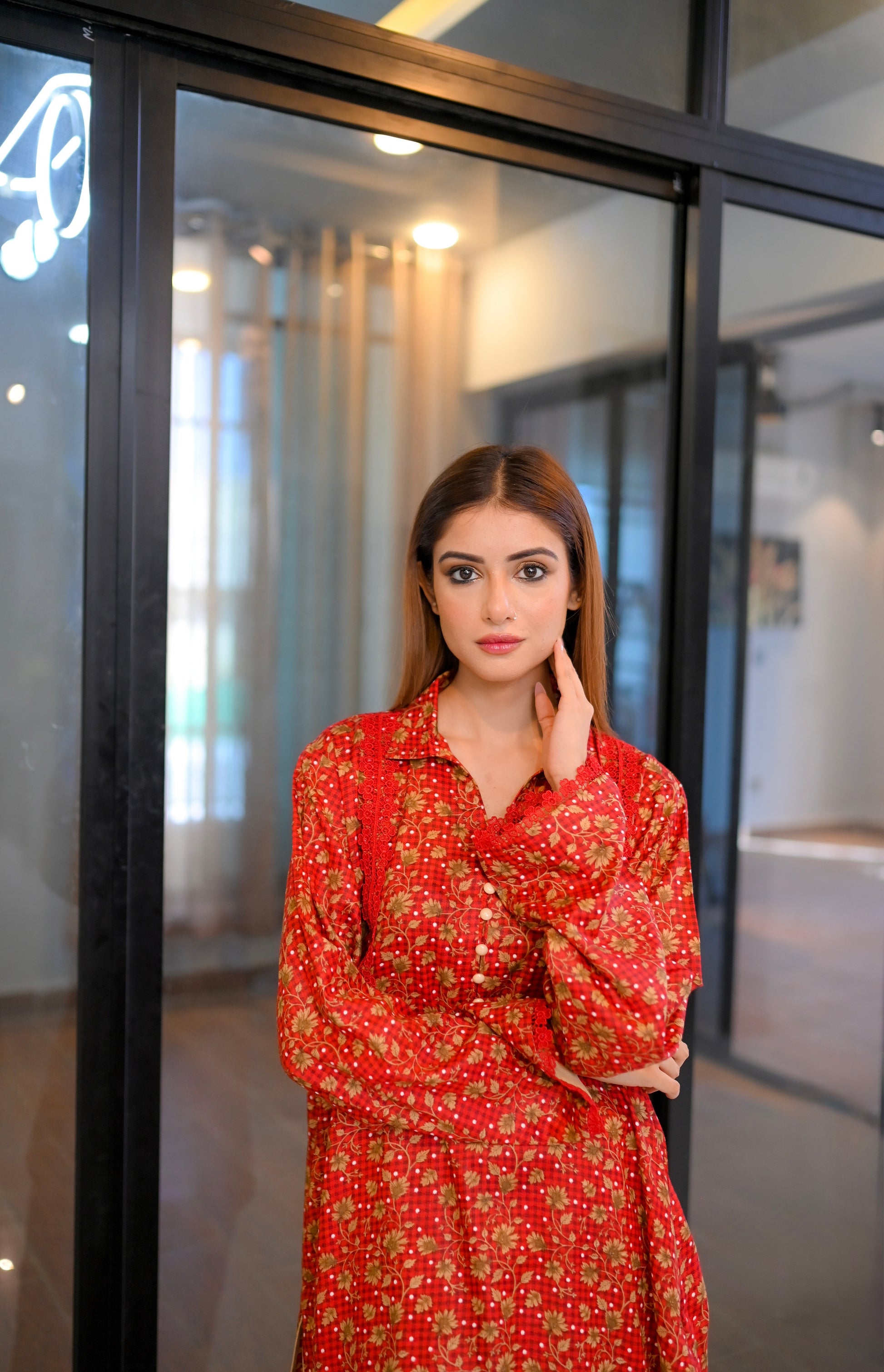 The deep scarlet base paired with delicate beige accents offers a modern yet timeless appeal — perfect for festive moments or sophisticated daywear. Crafted in premium lawn, the outfit balances comfort and grace, embodying Zareem’s signature fusion of contemporary style and cultural finesse.