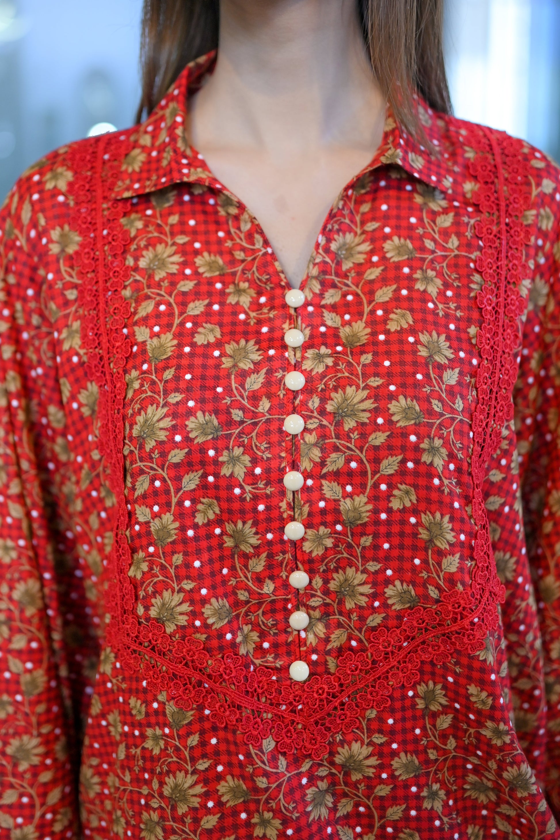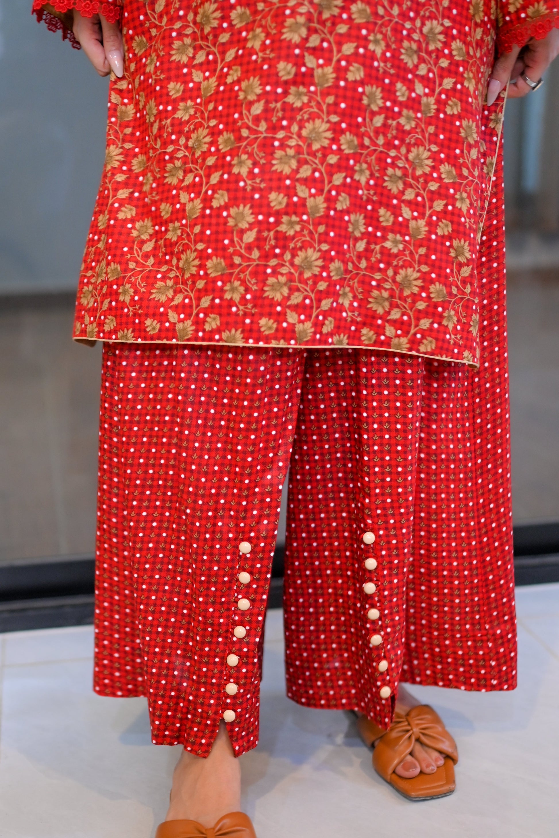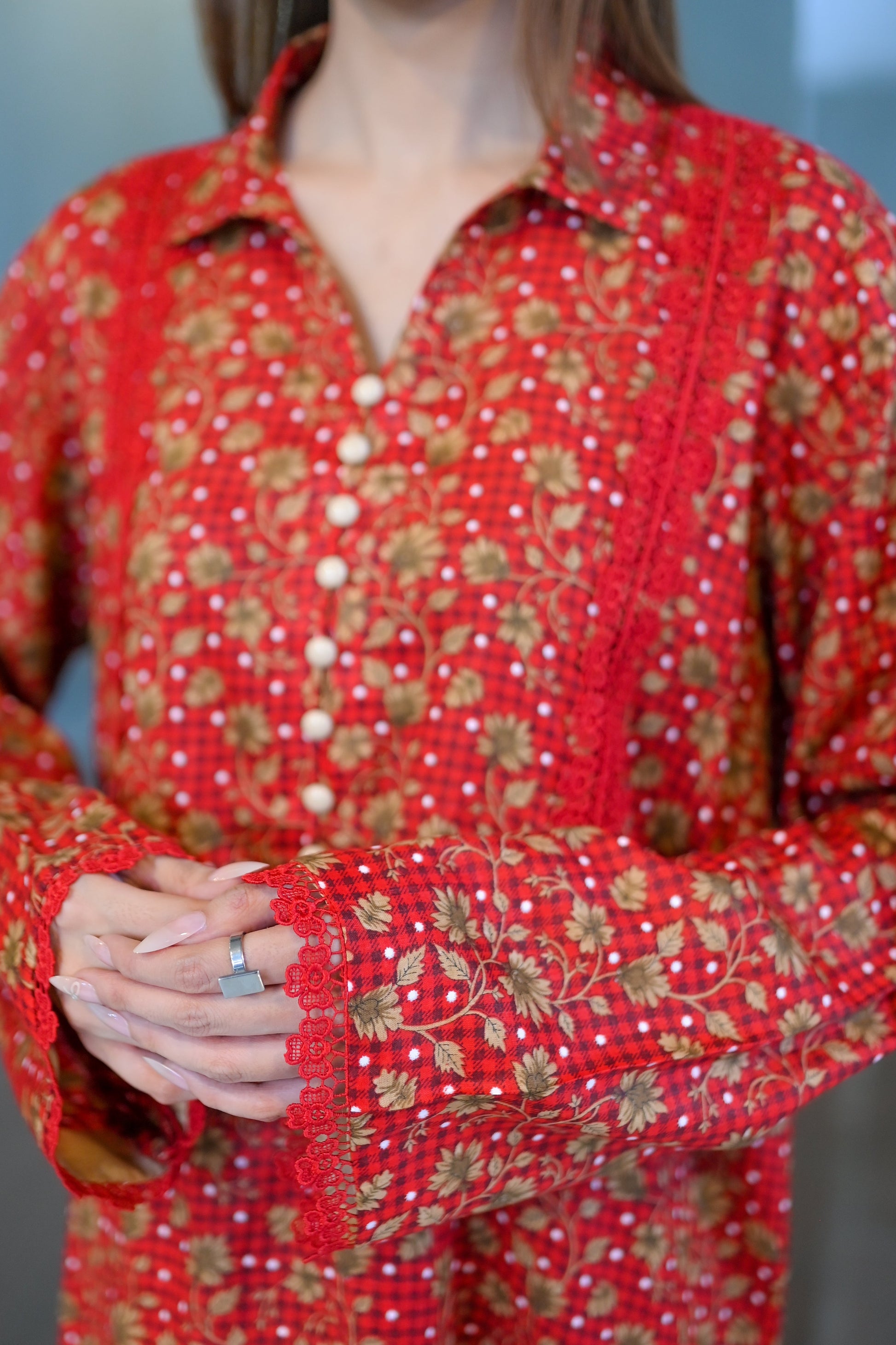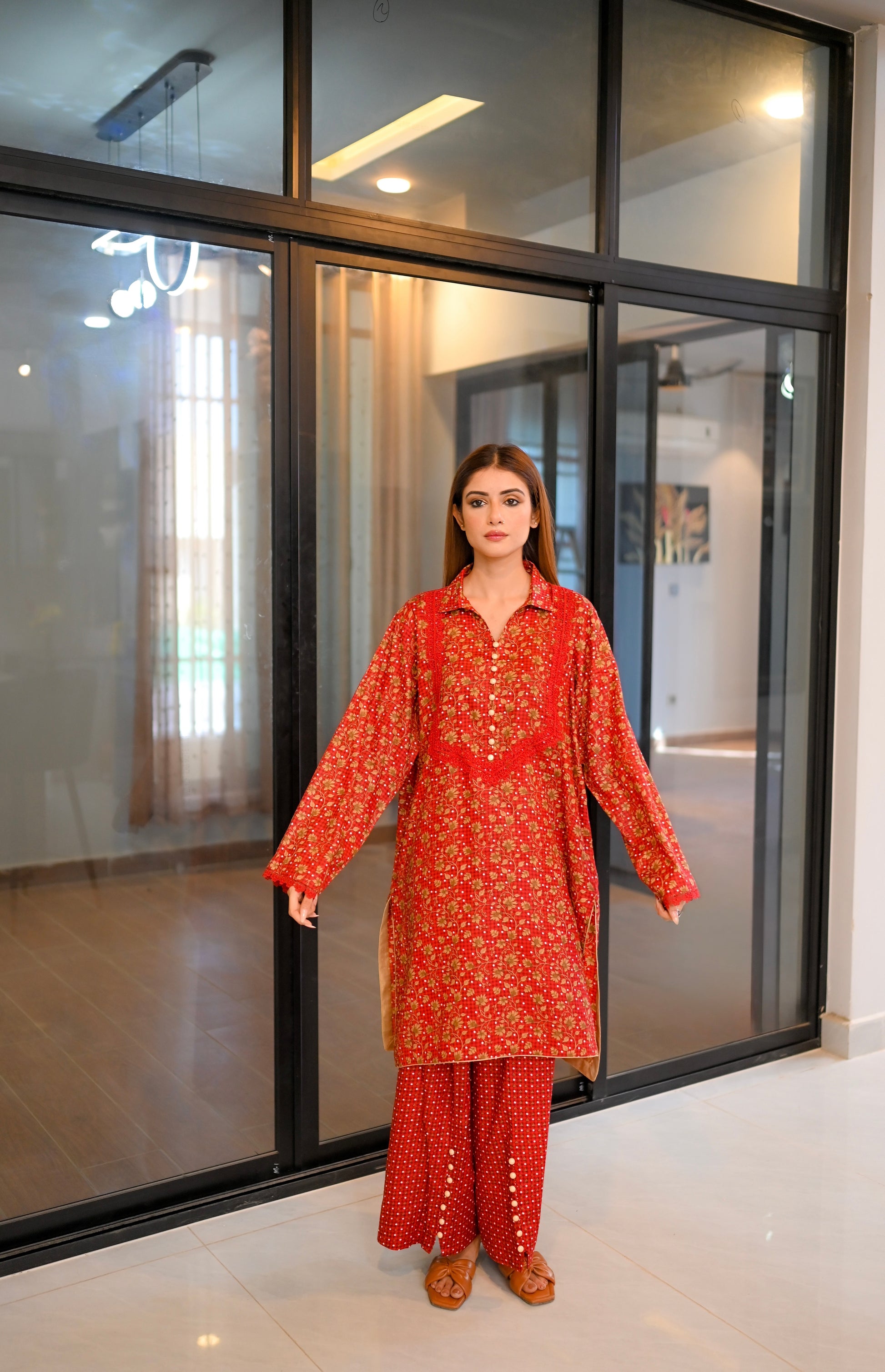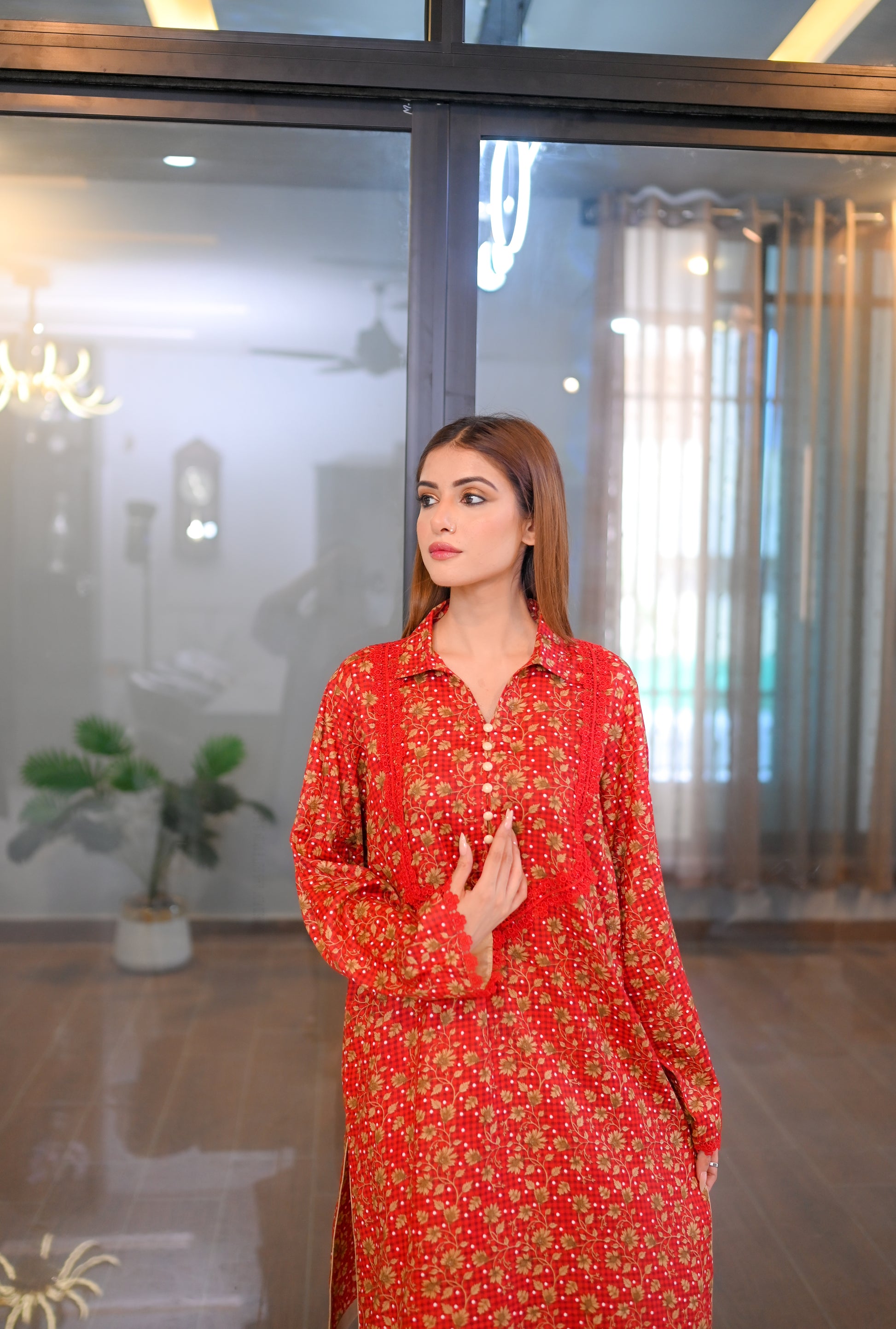 The deep scarlet base paired with delicate beige accents offers a modern yet timeless appeal — perfect for festive moments or sophisticated daywear. Crafted in premium lawn, the outfit balances comfort and grace, embodying Zareem’s signature fusion of contemporary style and cultural finesse.