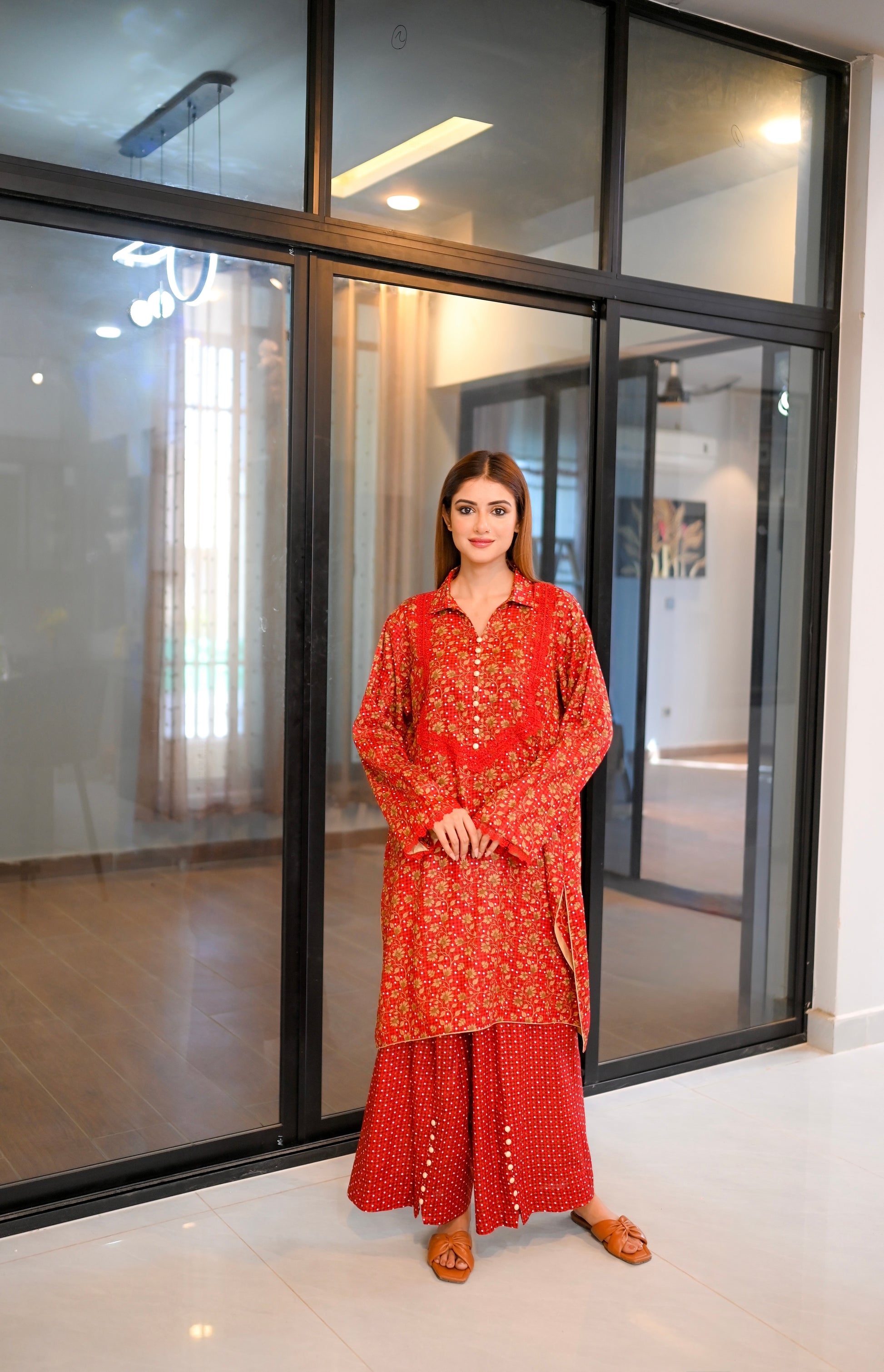 Step into refined elegance with Zareem Scarlet Grace. This striking ensemble features a beautifully detailed shirt adorned with intricate beige motifs, complemented by flared palazzo pants in a subtle polka dot pattern.